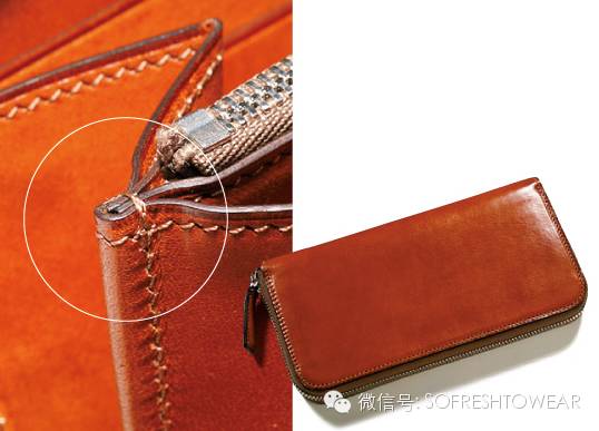 还有很多品牌会拿皮革做折边,好的折边也是很精细的,日本有种叫菊寄せ的工艺,把转角的地方缝得像菊花一样,可以让钱包更贴合,不过特别费工时。