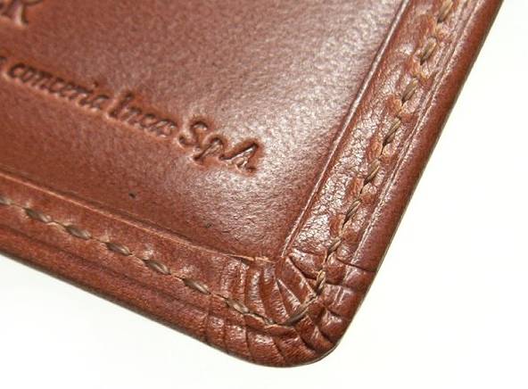 ——首先是真皮钱包的边缘。钱包是用几张皮革或者一些不同材质拼接起来的,所以皮革缝起来以后就要把边缘给封起来,否则难看啊。很多大牌最喜欢用油边的方式封边,也就是给包包的皮料边缘涂上一层油性物质。